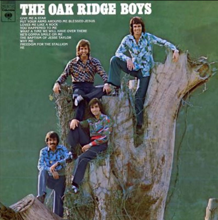 The Oak Ridge Boys started in the church, too. Their first iteration sang strictly gospel music, performing on the Grand Ole Opry as early as 1945 under the moniker of the Oak Ridge Quartet. They toured the southern gospel circuit and developed a huge following throughout the 1950s and into the ‘60s through several lineup changes, rechristening themselves the Oak Ridge Boys in 1961. In 1964, the first of their longtime lineup, William Lee Golden, joined, followed by Duane Allen a year or so later. Bass vocalist Richard Sterben was added in 1972, with Joe Bonsall completing their classic lineup in ‘73. By 1974, they took their first step away from gospel and toward secular country with the release of their self-titled release on Columbia. “The Baptism of Jesse Taylor”, co-written by the great Dallas Frazier and Sanger D. Shafer, was the perfect marriage of traditional country tropes (drinkin’, cheatin’) turned on their head through the lens of a good ol’ Sunday Baptism.