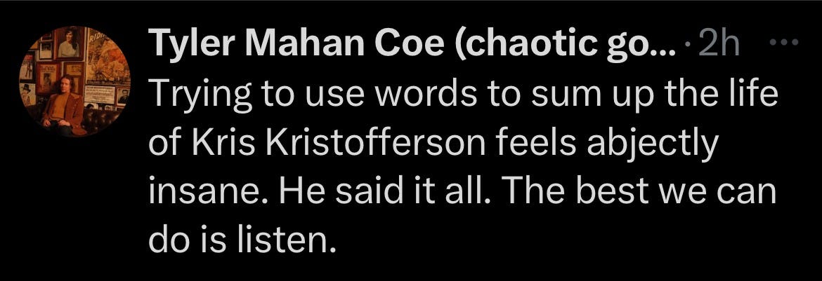 There’s not enough space to pay proper tribute to such an icon of American music. In moments like this, mere words cannot do Kris Kristofferson justice. Many people in the next few days will be offering beautiful essays, anecdotes, and memories of this titan of songwriting, this warrior for justice, and a damn fine actor as well. In the end, however, as Tyler Mahan Coe put it: